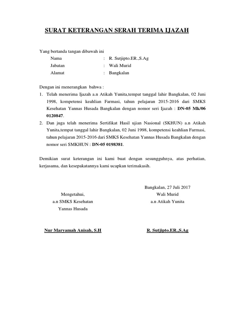 Tidak perlu khawatir kini telah tersedia berbagai contoh surat pernyataanuntuk berbagai keperluan sehingga memudahkan anda untuk membuat surat pernyataan sesuai kebutuhan misalnya surat pernyataan. 3 contoh qalqalah kubra dalam surat al ikhlas; Demikian surat tanda terima ini di buat dokumen disimpan guna untuk penjamin kinerja selama menjadi karyawan di pt. Selain itu kami juga membagikan berita acara serah terima blangko ijazah yang rusak. Contoh surat pernyataan kehilangan tanda terima ijazah contoh surat pernyataan kenaikan limit kartu kredit bni contoh surat pernyataan kesediaan menjadi calon kepala desa Contoh surat pernyataan adalah surat yang digunakan untuk menyatakan sesuatu kepada penerima. Kejadian kehilangan dokumen penting ini juga pernah kami alami sendiri. Surat keterangan kehilangan dari kepolisian. You merely have to click on the gallery below the contoh surat tanda terima ijazah dari perusahaan picture. Terima kasih telah berkunjung, kami nantikan kunjungannya kembali di lain waktu. Surat keterangan pengganti ijazah format 639 x 920 contoh surat keterangan hilang ijazah terbaru format 502 x 415 pixel download surat keterangan pengganti ijazah hilang tas dmin blog format 746 x 1039 pixel download keterangan ijazah hilang tas dmin blog format 731 x 1004 pixel. Surat tanda kehilangan ijazah atau surat keterangan ijazah. Hopefully you are enjoy and lastly will get the best picture from our collection that uploaded here and also use for suited needs for personal use.